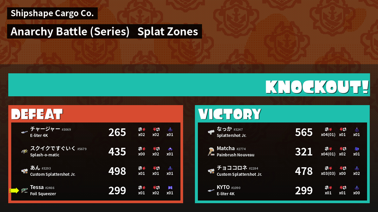 | Medals | #1 Splattercolor Screen User #2 Overall Splatter #2 Splat Zone Inker | ||