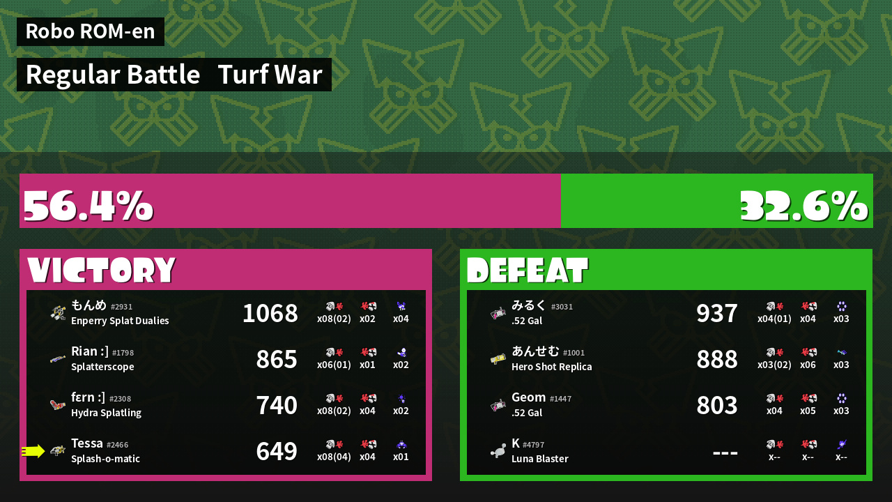 | Medals | #1 Overall Splatter #1 Enemy-Base Inker #1 Super Jump Spot | ||