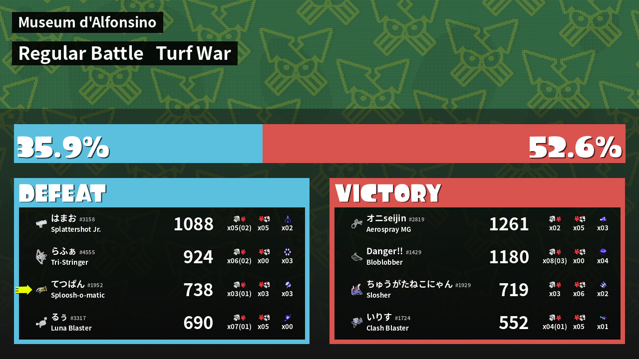 | 真夏の雪だるま はまお #3158 |  Splattershot Jr.     | 1,088 | 3 + 2 | 5 | 0.60 |  2 | |