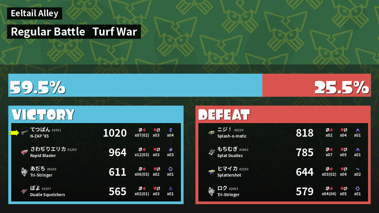 | バンカラな若者 もちむぎ #1662 |  Splat Dualies     | 785 | 7 + 0 | 5 | 1.40 |  1 | |