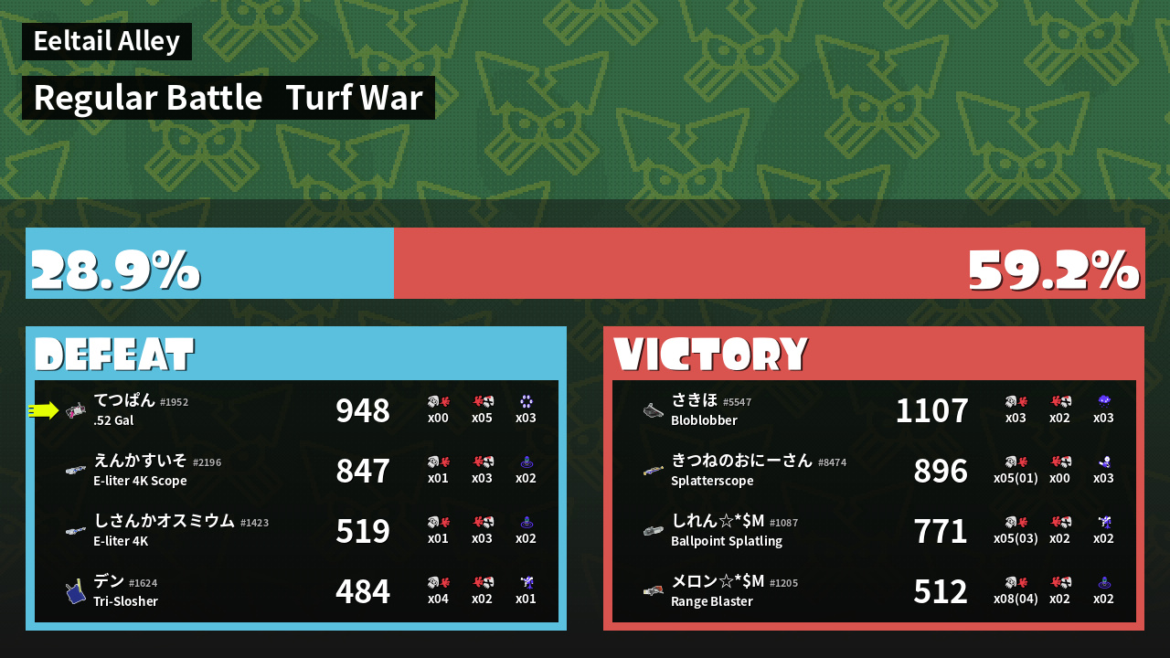 | 最強のすりみ連合ファン しれん☆*$M #1087 |  Ballpoint Splatling     | 771 | 2 + 3 | 2 | 1.00 |  2 | |