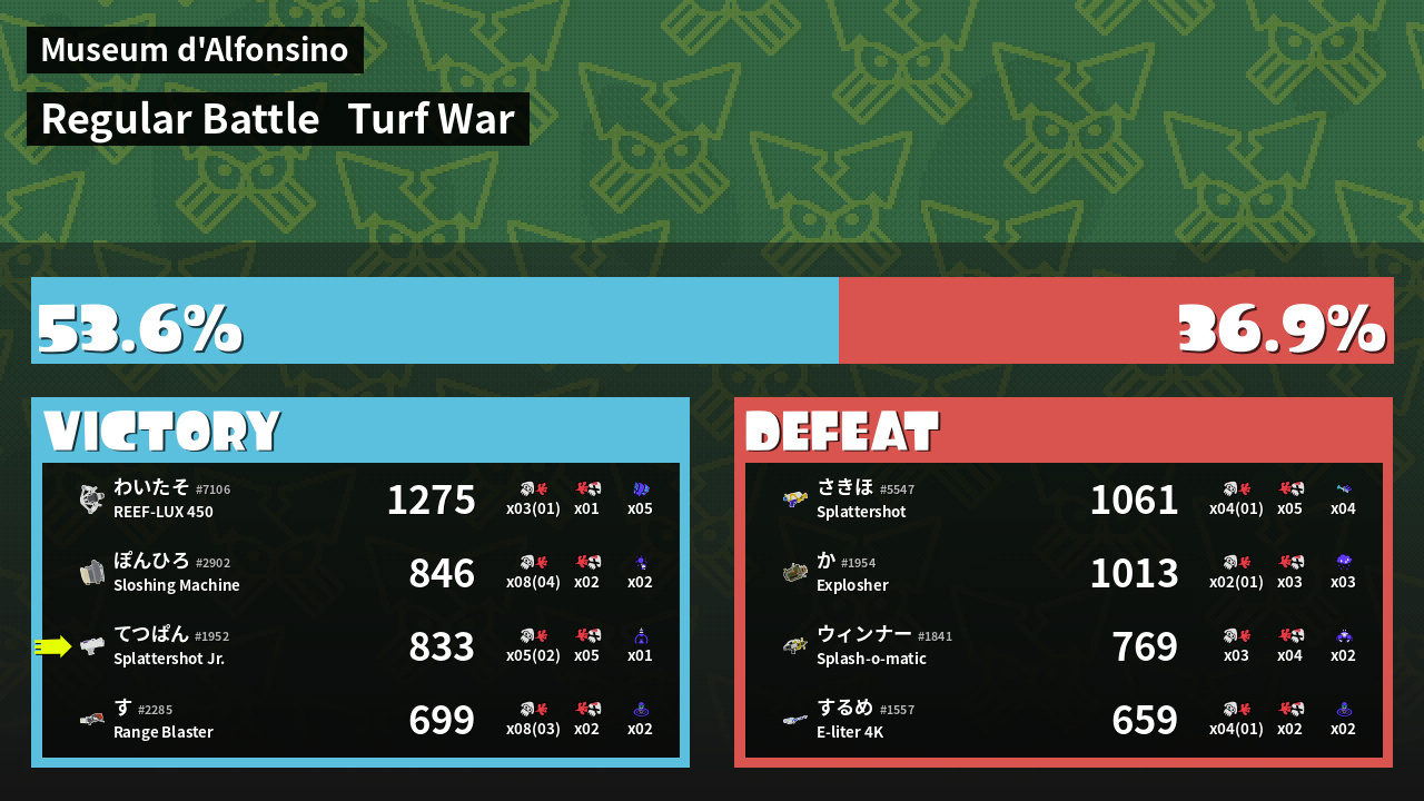 | バンカラな若者 てつぱん #1952 |  Splattershot Jr.     | 833 | 3 + 2 | 5 | 0.60 |  1 | |