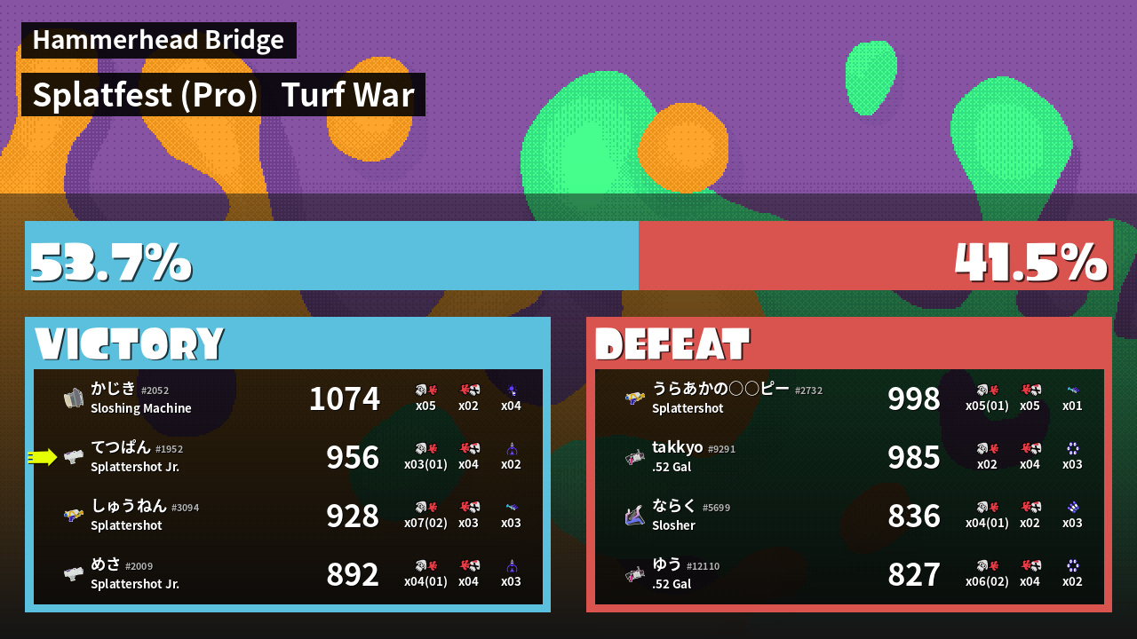 | バンカラな若者 てつぱん #1952 |  Splattershot Jr.     | 956 | 2 + 1 | 4 | 0.50 |  2 | |