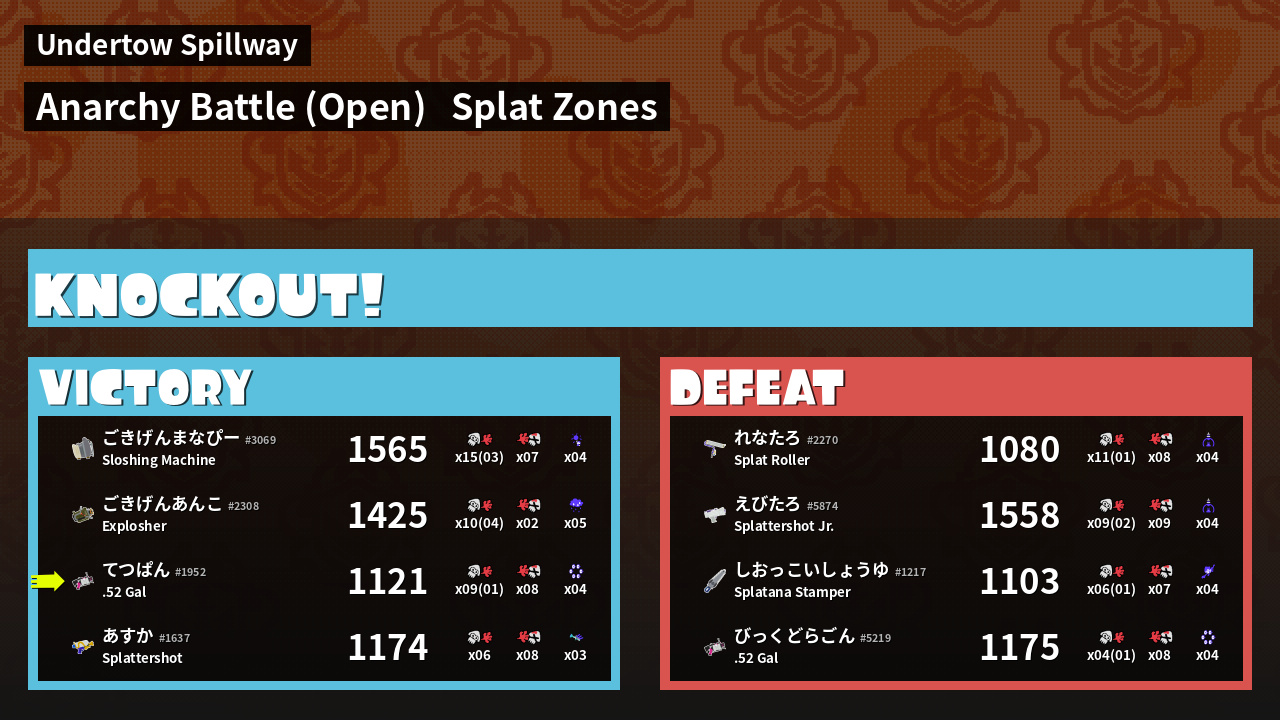 | バンカラな若者 あすか #1637 |  Splattershot     | 1,174 | 6 + 0 | 8 | 0.75 |  3 | |