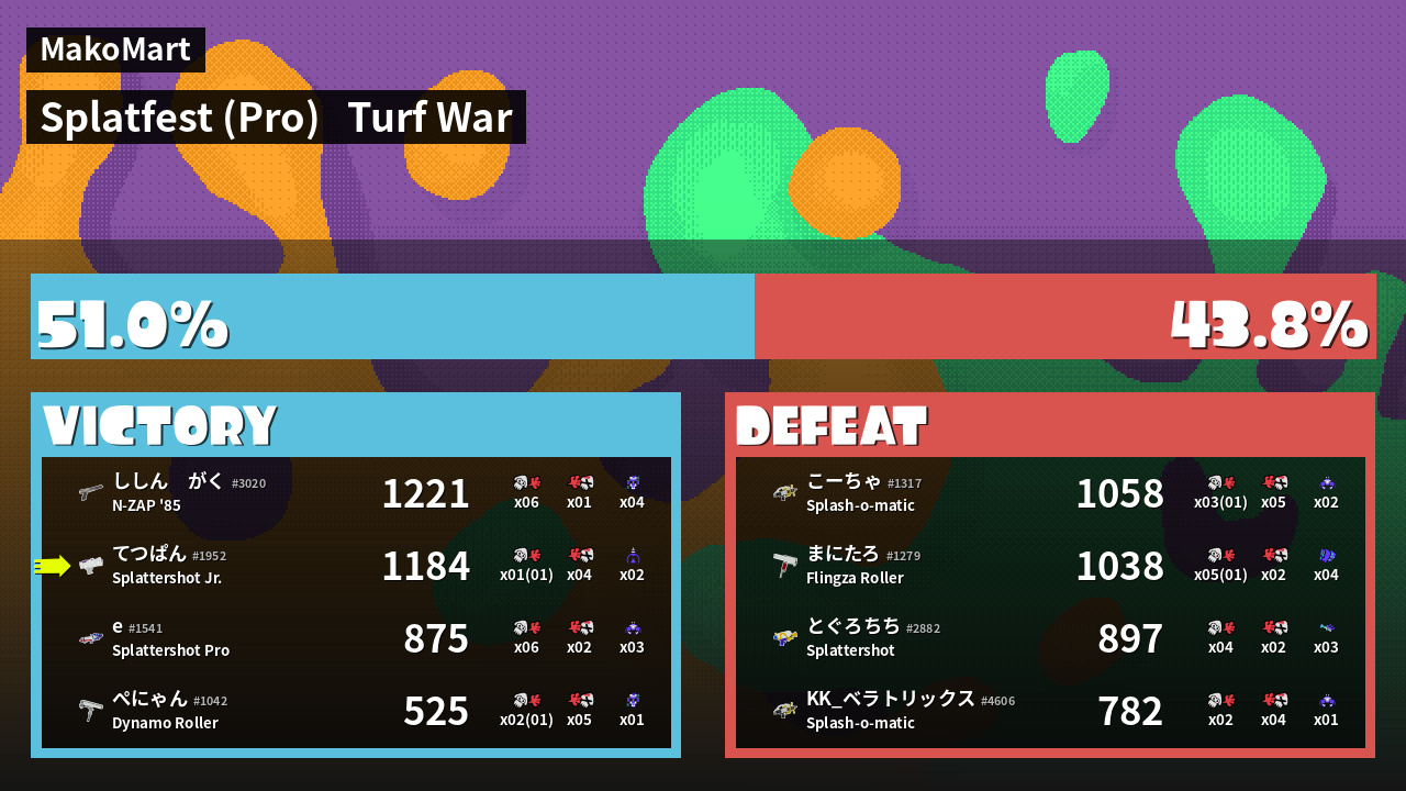 | ヌルヌルの申し子 e #1541 |  Splattershot Pro     | 875 | 6 + 0 | 2 | 3.00 |  3 | |