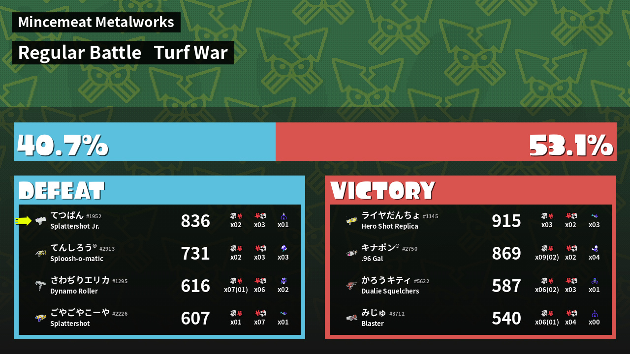 | 光の丼 てつぱん #1952 |  Splattershot Jr.     | 836 | 2 + 0 | 3 | 0.67 |  1 | |