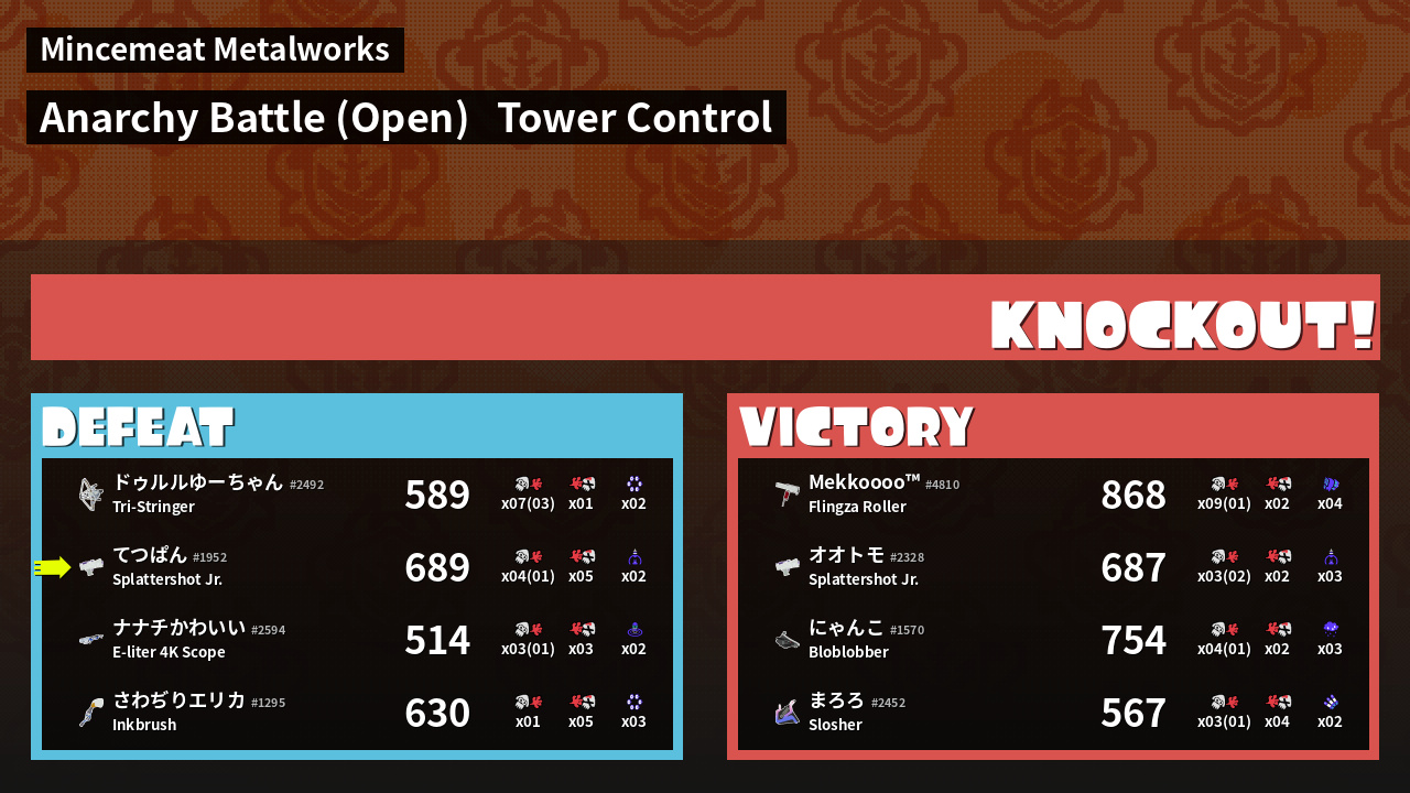 | バンカラな若者 てつぱん #1952 |  Splattershot Jr.     | 689 | 3 + 1 | 5 | 0.60 |  2 | |