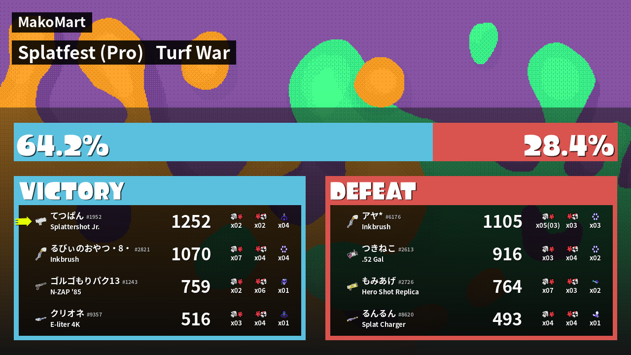 | バンカラな若者 てつぱん #1952 |  Splattershot Jr.     | 1,252 | 2 + 0 | 2 | 1.00 |  4 | |