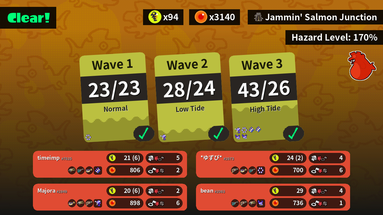 | Weapons | Sploosh-o-matic Jet Squelcher Mini Splatling | Jet Squelcher Squeezer Sploosh-o-matic | Squeezer Mini Splatling Jet Squelcher | Mini Splatling Sploosh-o-matic Squeezer |