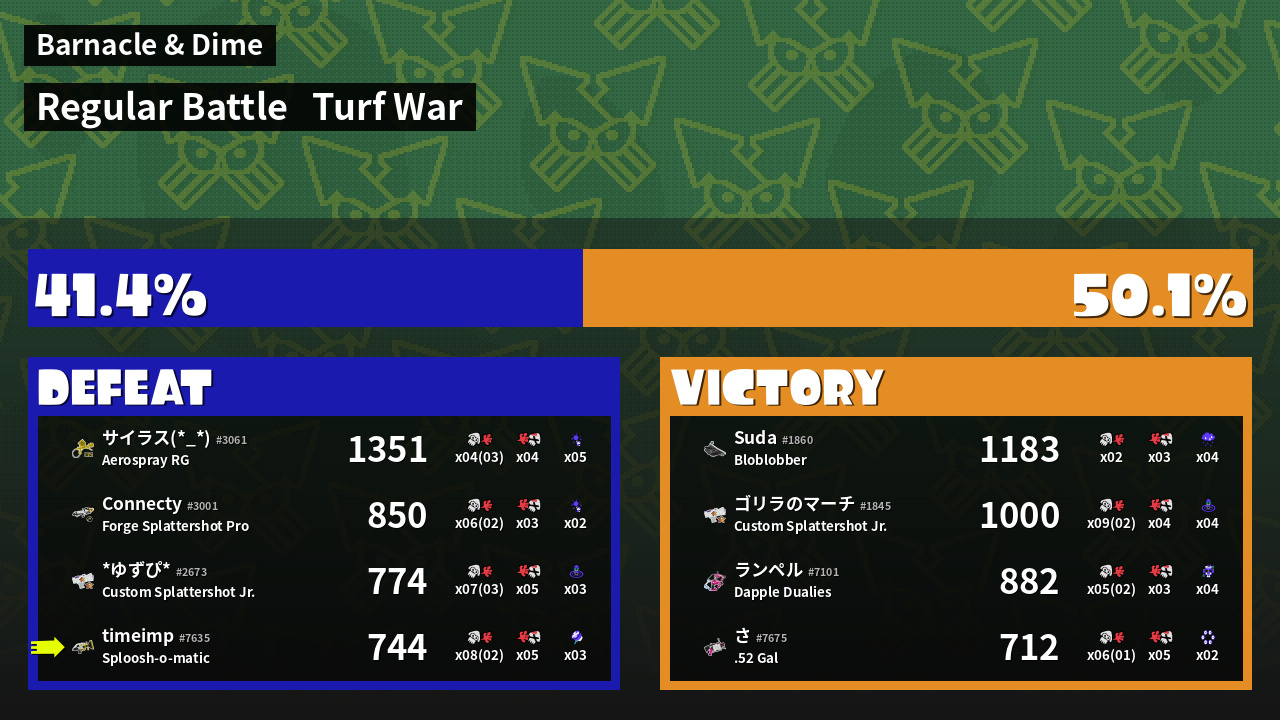 | Medals | #1 Overall Splatter #1 Enemy-Base Inker #1 Enemy Splatter | ||