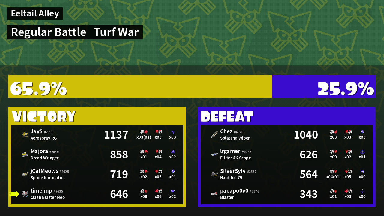 | Medals | #1 Overall Splatter #1 Popular Target #1 Enemy-Base Inker | ||