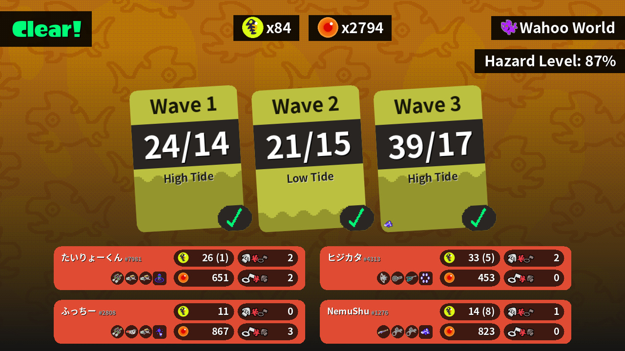 | Weapons | Splat Dualies Grizzco Blaster Grizzco Blaster | Tri-Stringer Nautilus 47 Jet Squelcher | Splat Charger Aerospray MG Aerospray MG | Splat Dualies Goo Tuber Grizzco Blaster |