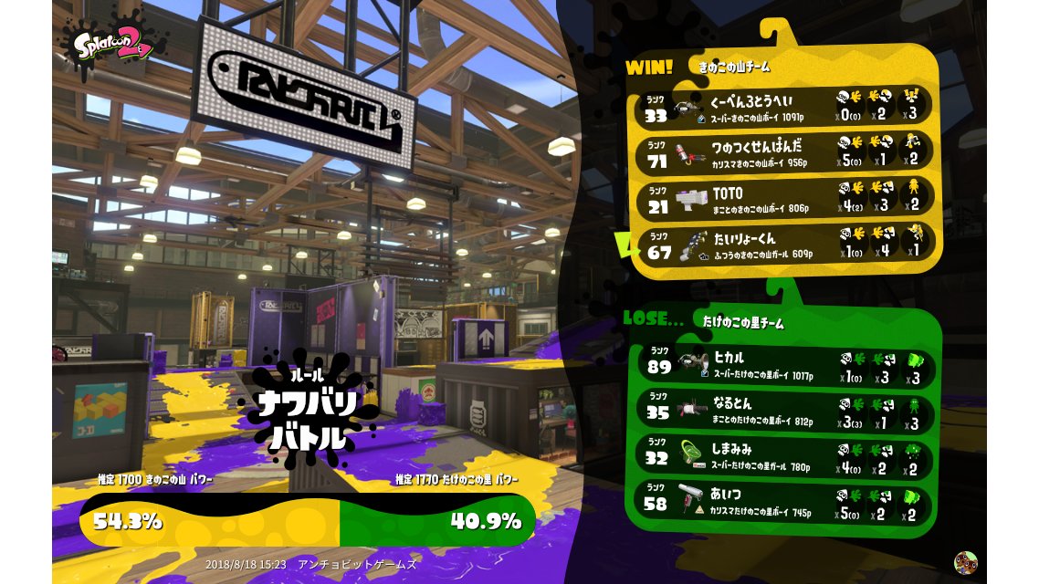| Team たけのこの里 | 3,354 | 10 / 8 | 1.25 55.56% | ||||