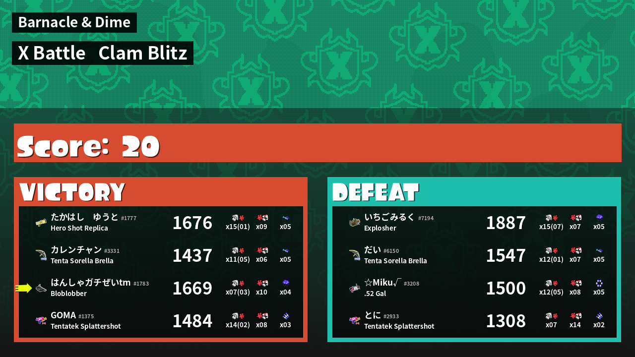 | Medals | #1 Clam Carrier #1 Super Jump Spot #1 Ink Storm User | ||