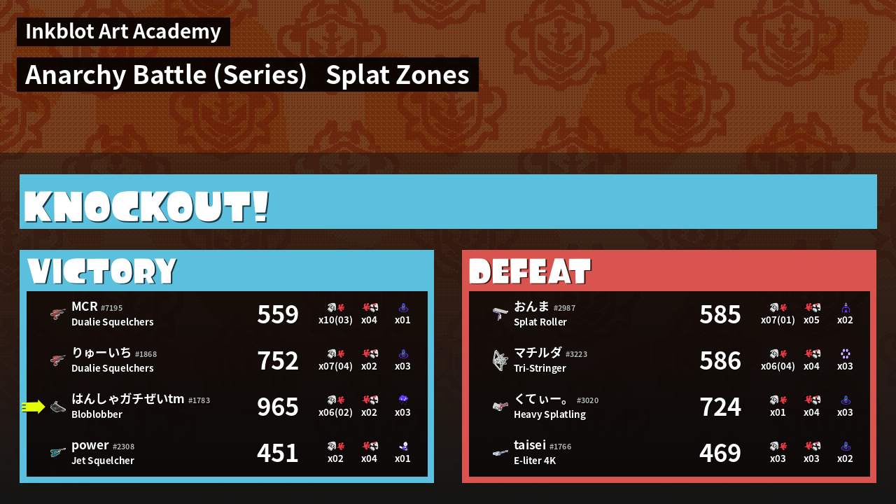 | Medals | #1 Splat Zone Inker #1 Turf Inker #1 Splat Zone Hero | ||||
