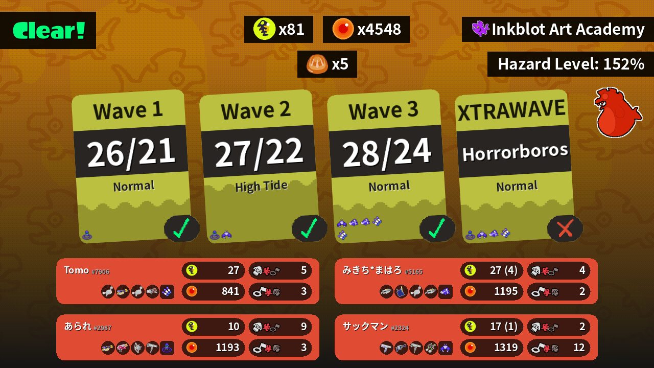 | Weapons | Luna Blaster Mini Splatling Luna Blaster Blaster | Grizzco Brella Tri-Slosher Luna Blaster Grizzco Brella | Big Swig Roller H-3 Nozzlenose Dynamo Roller Splat Dualies | Mini Splatling Rapid Blaster Tri-Stringer Dynamo Roller |
