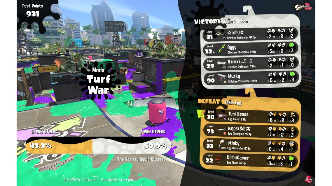 | Team Chicken The Variety Squid Quartet Win Streak: 1 | 3,303 | 13 / 7 | 1.86 65.00% | ||||