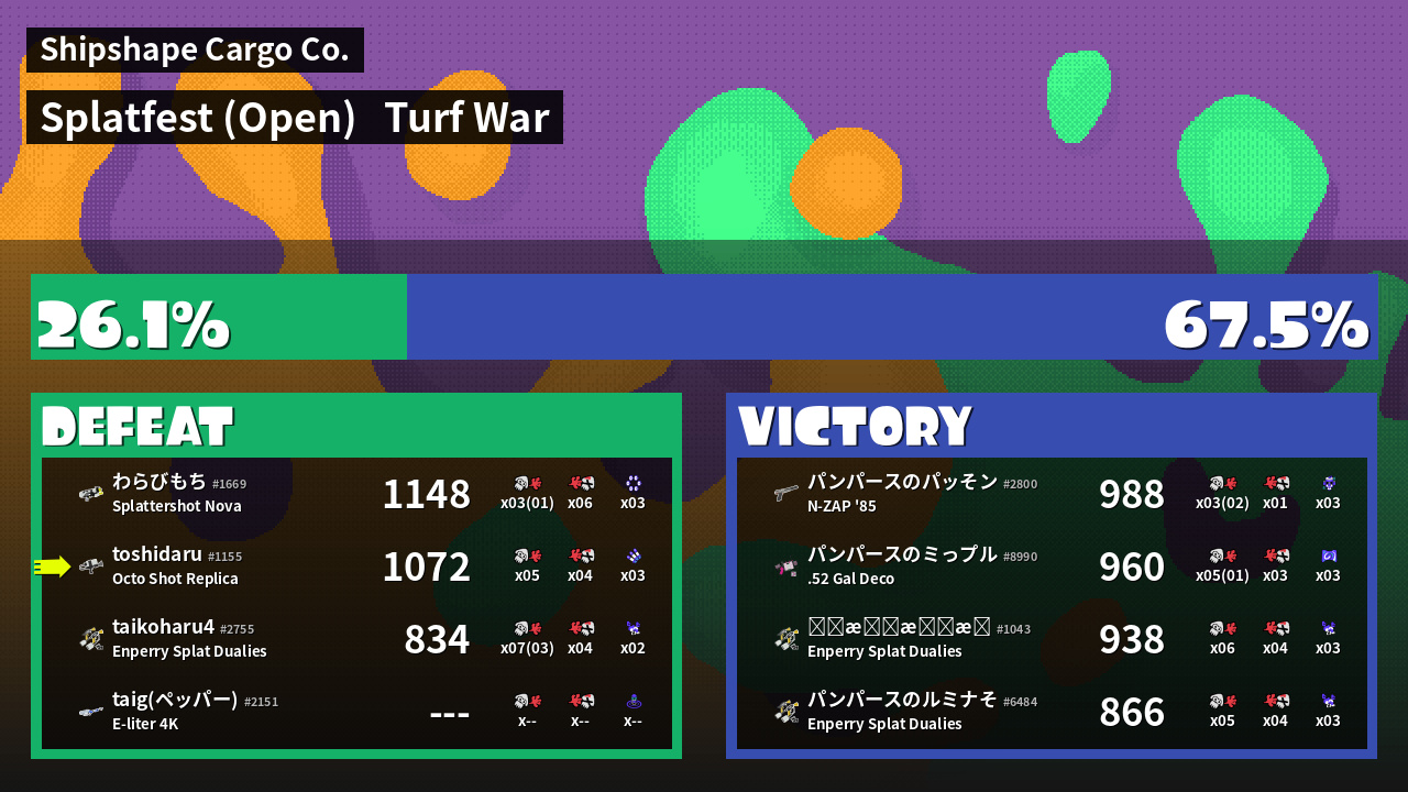 | Medals | #1 Enemy-Base Inker #1 Super Jump Spot #1 Enemy Splatter | ||