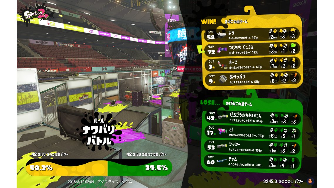 | Splatfest Title | きのこの山 Defender 38 → きのこの山 Defender 47 | |||||||||||||||||||||||||||||||
