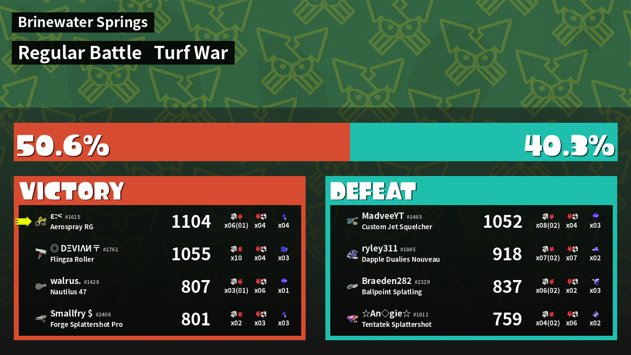 | Medals | #1 Turf Inker #1 Splat Assister #2 Overall Splatter | ||