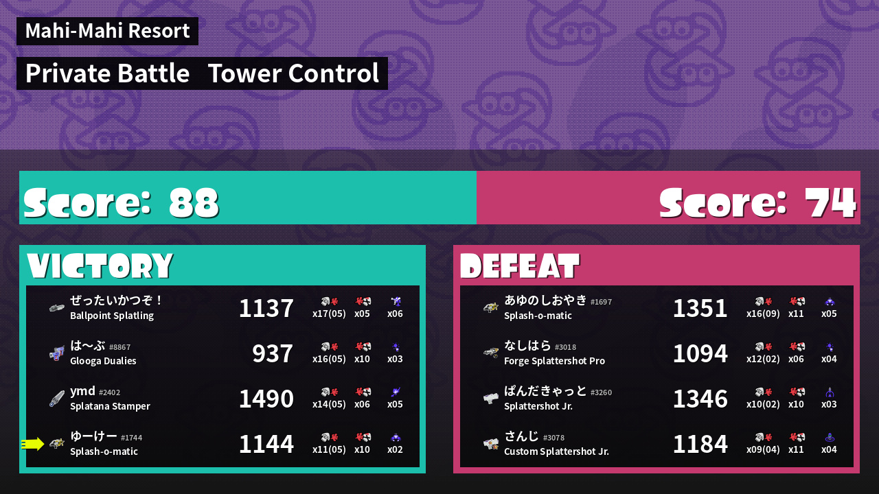 | Medals | #1 Super Jump Spot #1 Splat Assister #1 Damage Taker | ||