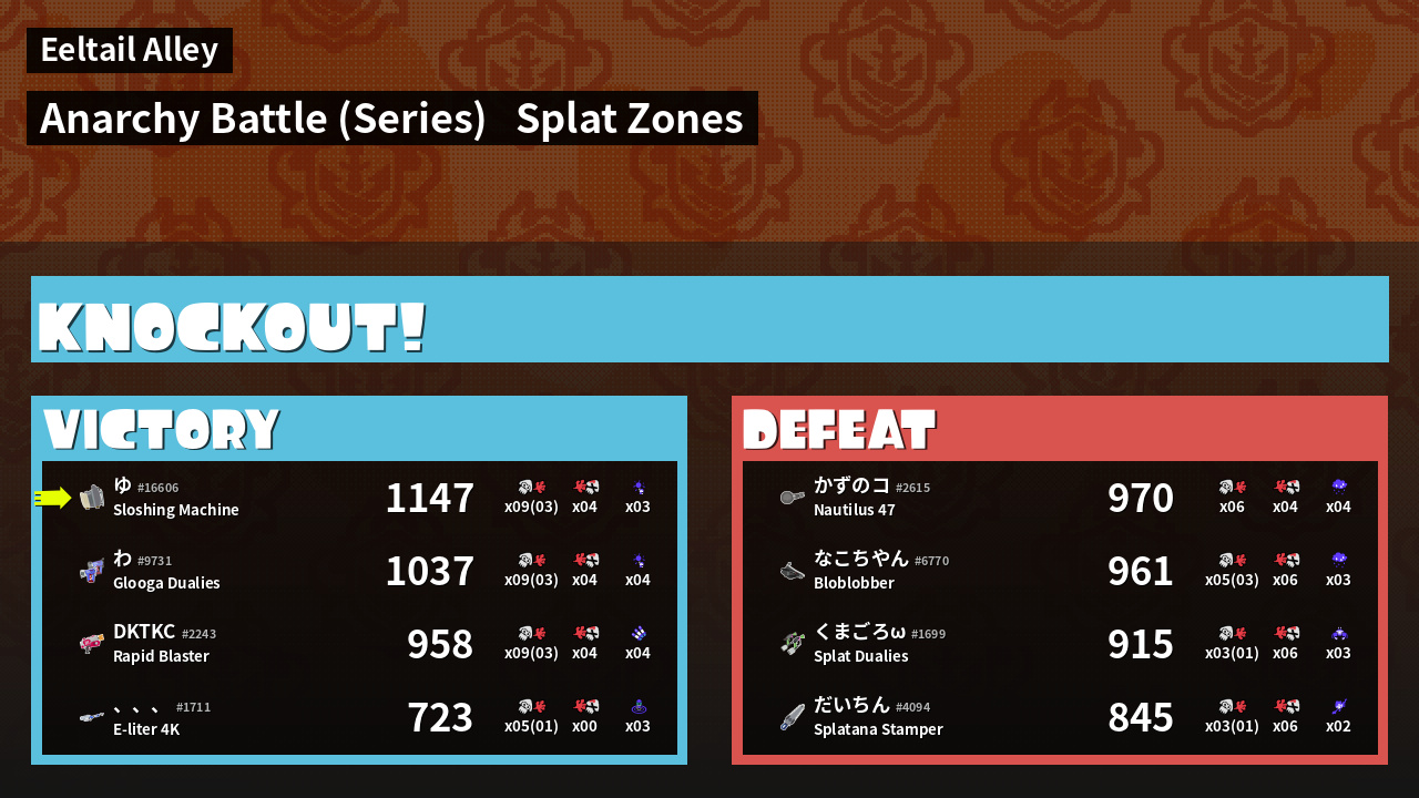 | Medals | #1 Overall Splatter #1 Turf Inker #1 Enemy Splatter | ||