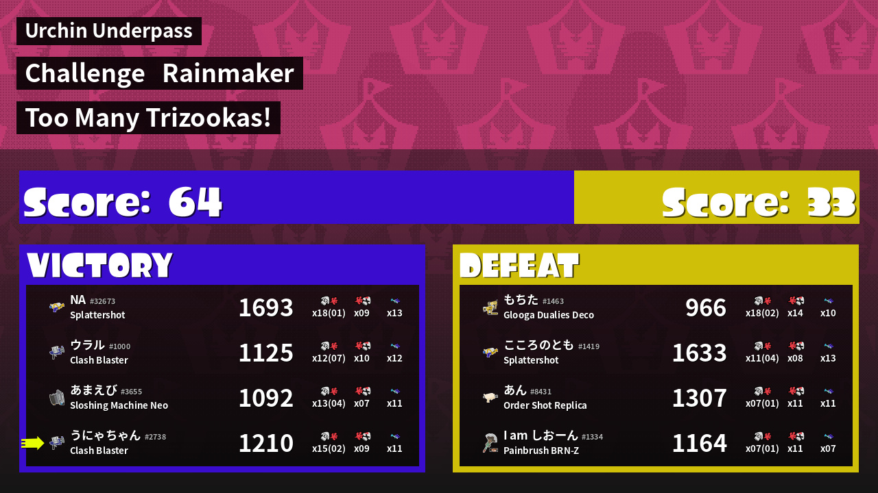 | Medals | #1 Rainmaker Stopper #1 Damage Taker #2 Overall Splatter |