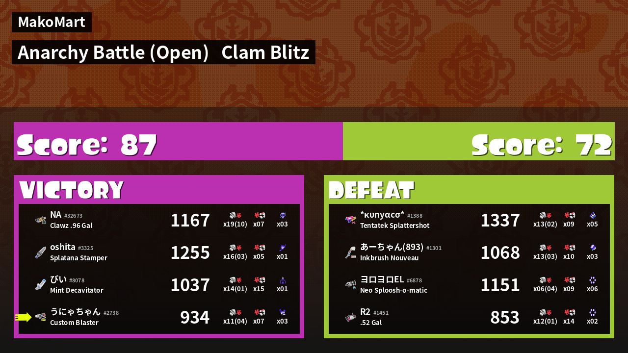 | Mode | Clam Blitz - Anarchy Battle (Open) |