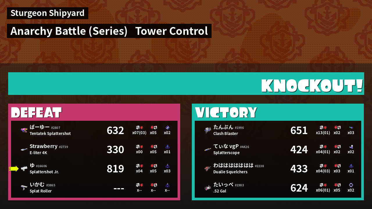 | Medals | #1 Turf Inker #1 Enemy Splatter #1 Ground Traveler | ||