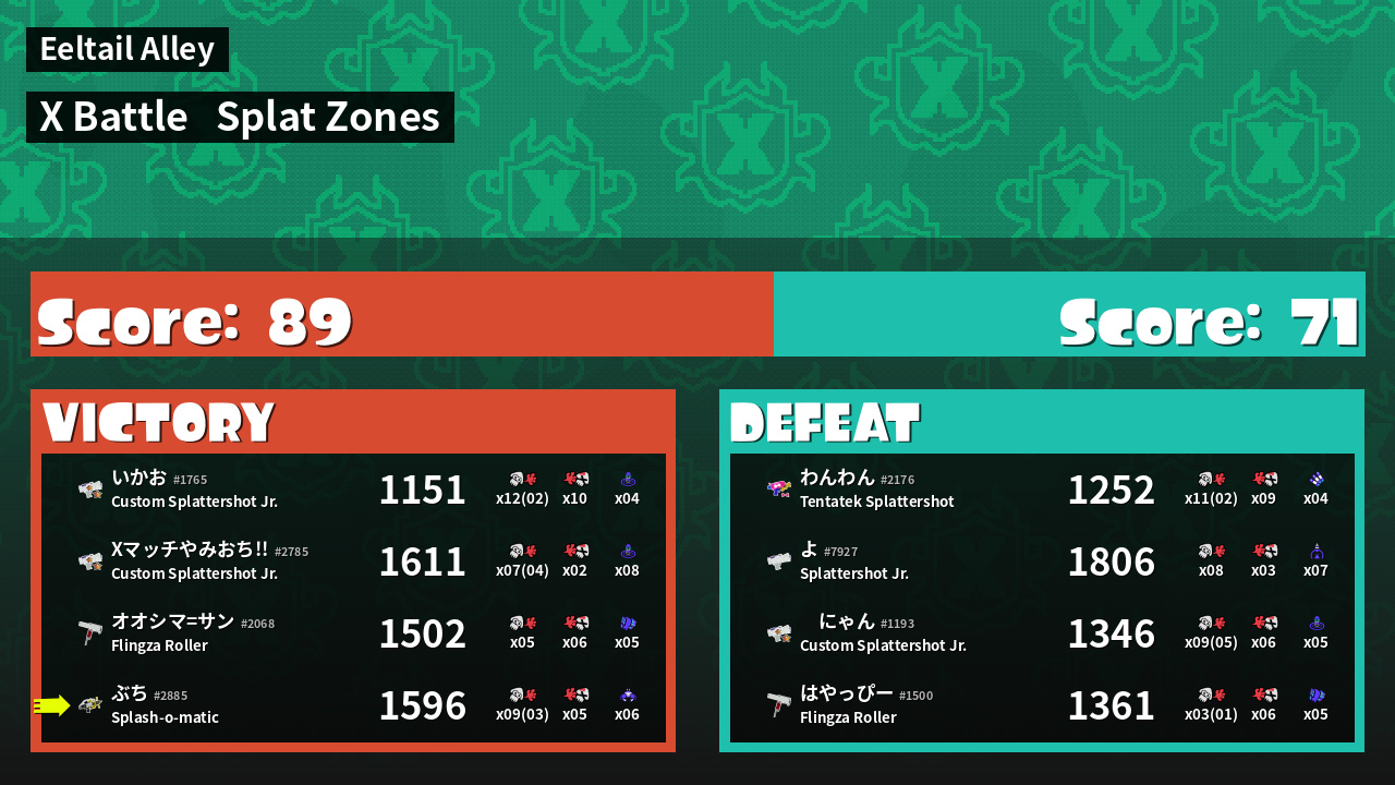 | Medals | #1 Crab Tank User #2 Overall Splatter #2 Splat Zone Inker | ||