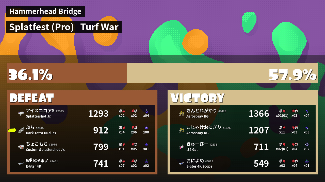 | Medals | #1 Enemy-Base Inker #1 Base Defender #2 Overall Splatter | ||