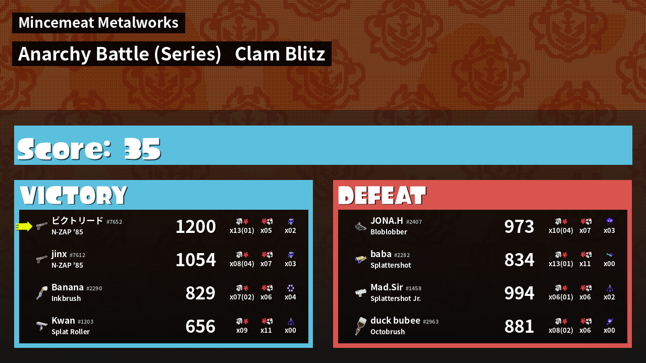 | Medals | #1 Overall Splatter #1 Score Booster #1 Clam Carrier | ||