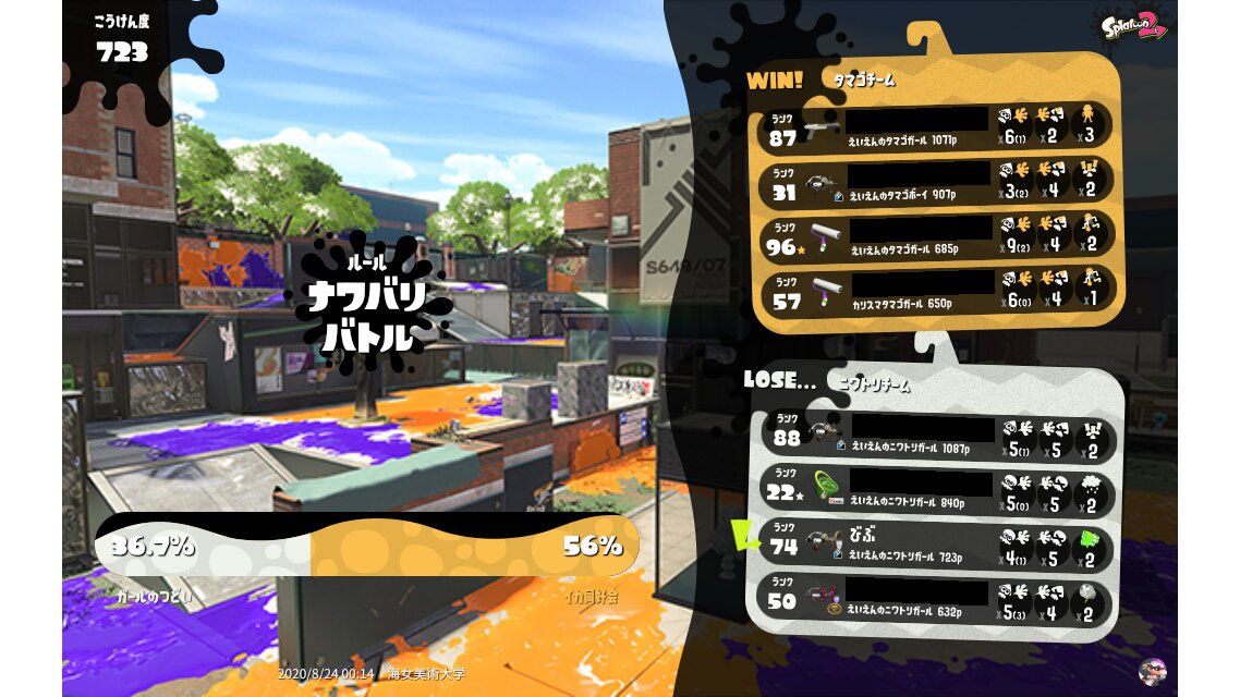 | Team タマゴ イカ同好会 Win Streak: 0 | 3,313 | 19 / 14 | 1.36 57.58% | ||||