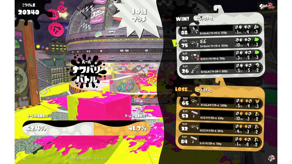 | Team タマゴ イカ軍団 Win Streak: 1 | 3,703 | 18 / 16 | 1.12 52.94% | ||||