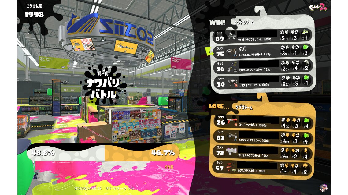 | Team タマゴ イカ会 Win Streak: 0 | 3,964 | 12 / 12 | 1.00 50.00% | ||||