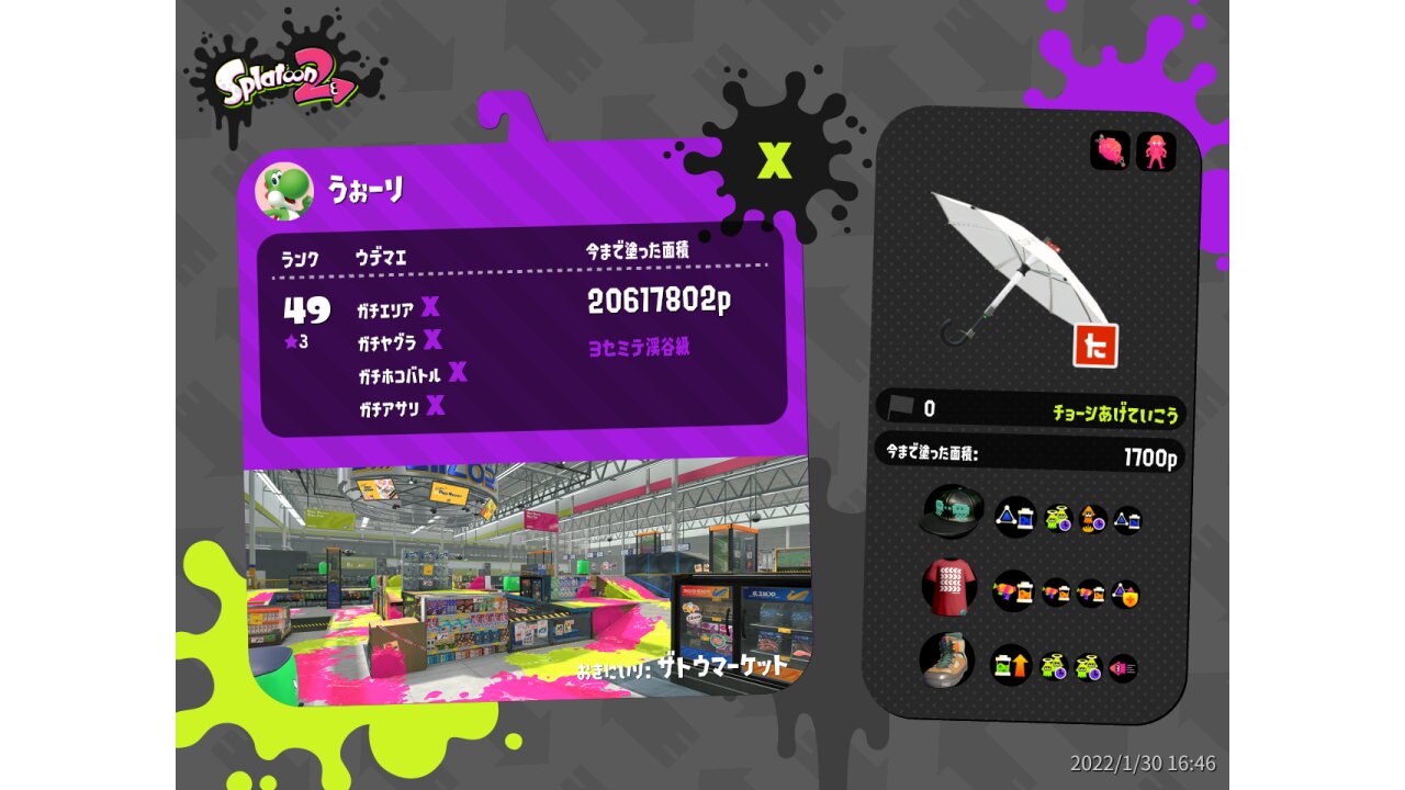 | Weapon | Kensa Undercover Brella ( Torpedo, Ink Armor) | ||||||||||||||||||||||||||||||||||||||||