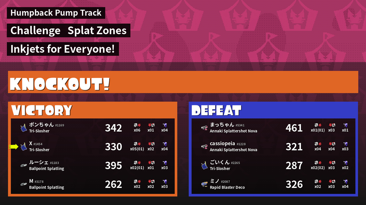 | Medals | #1 Splat Zone Guard #1 Splat Assister #1 Ink Consumer | ||
