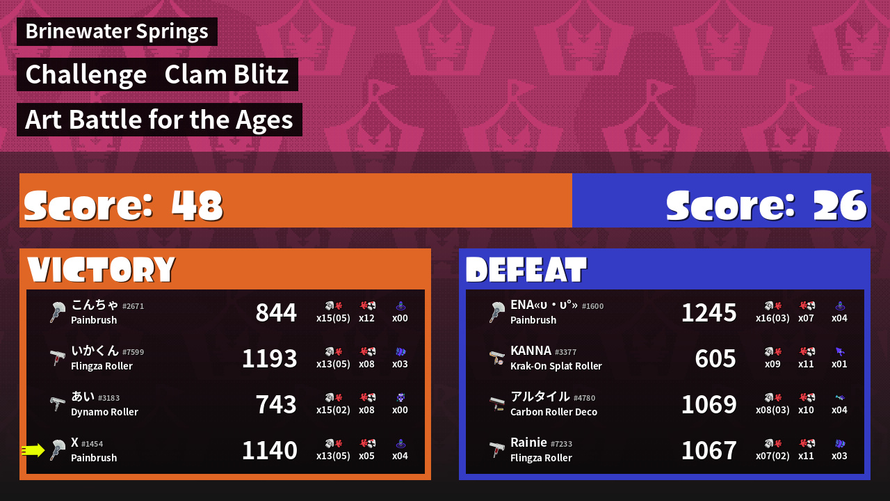 | Medals | #1 Super Jump Spot #1 Splat Assister #1 Clam Stopper | ||