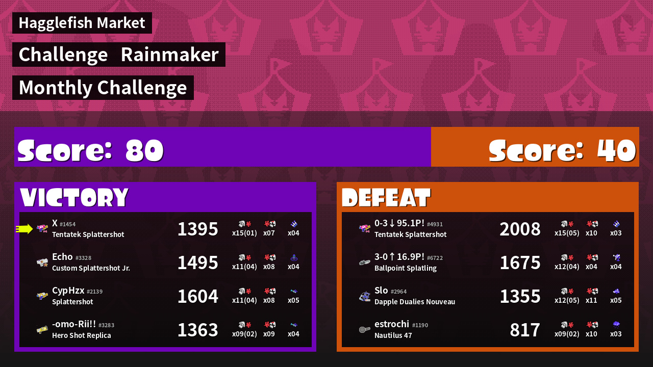 | Medals | #1 Overall Splatter #1 Popular Target #1 Enemy Splatter | ||
