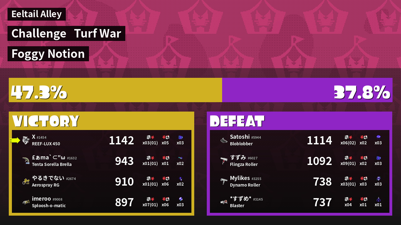| Medals | #1 Turf Inker #1 Splat Assister #1 Damage Taker | ||