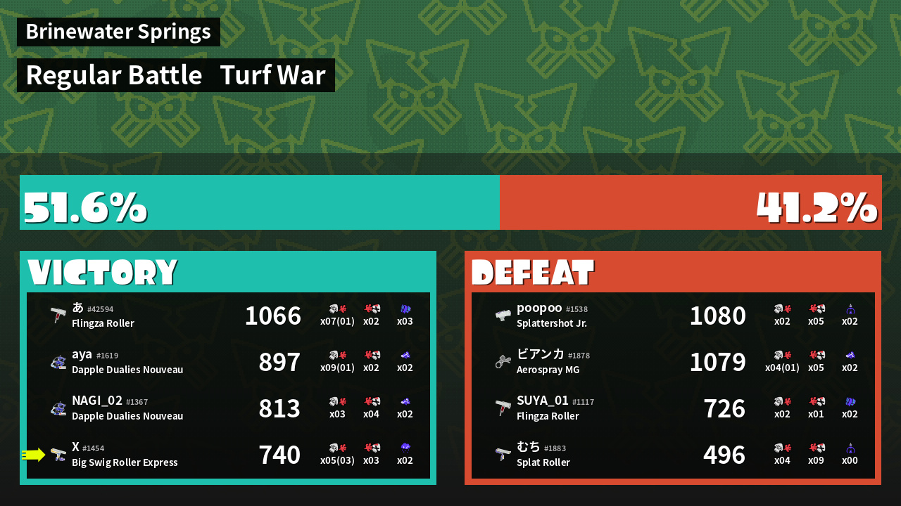 | Medals | #1 Popular Target #1 Enemy-Base Inker #1 Splat Assister | ||