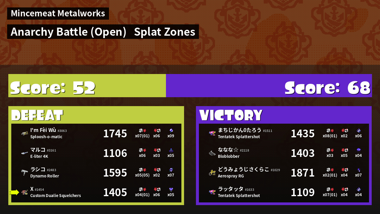 | Mode | Splat Zones - Anarchy Battle (Open) | ||