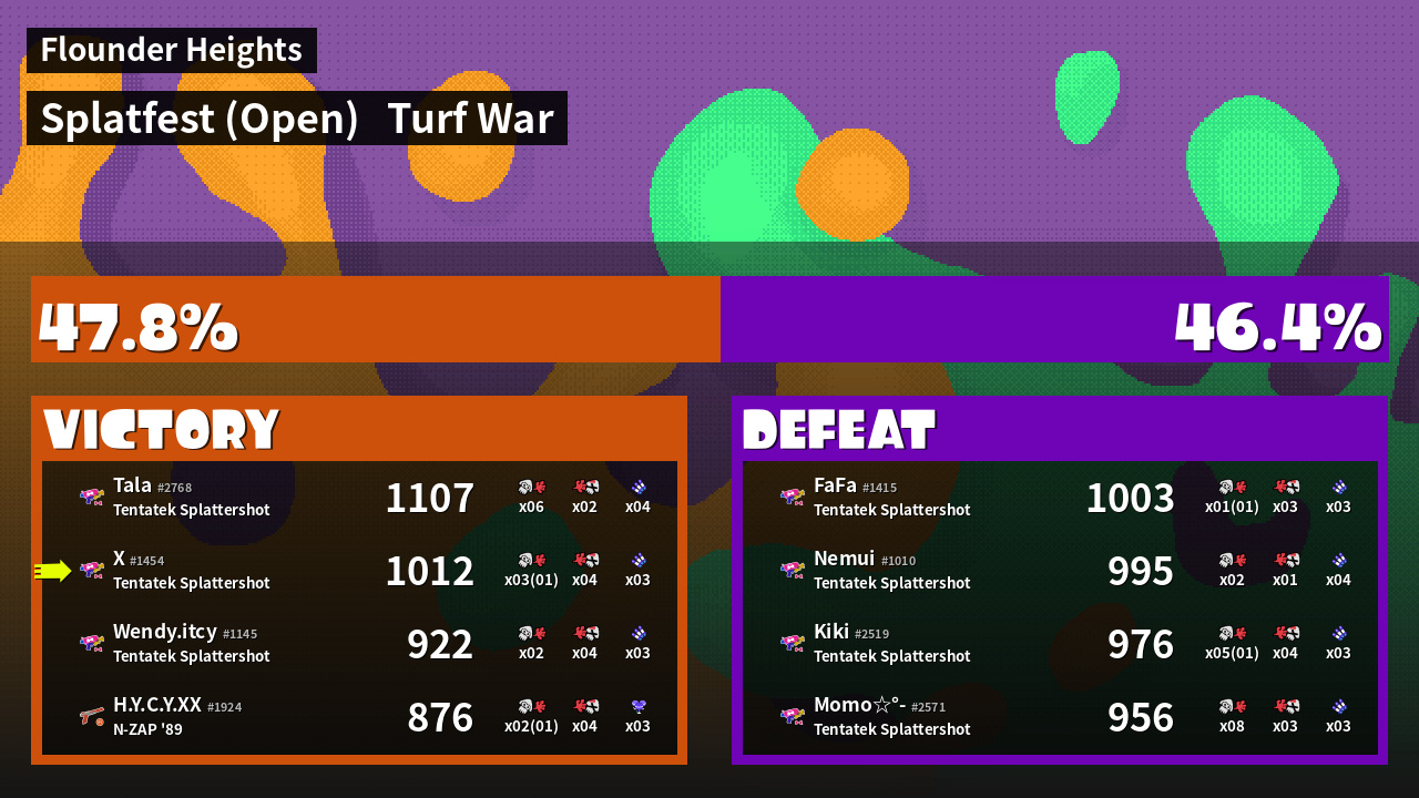 | Medals | #1 Enemy-Base Inker #1 Splat Assister #2 Overall Splatter | ||
