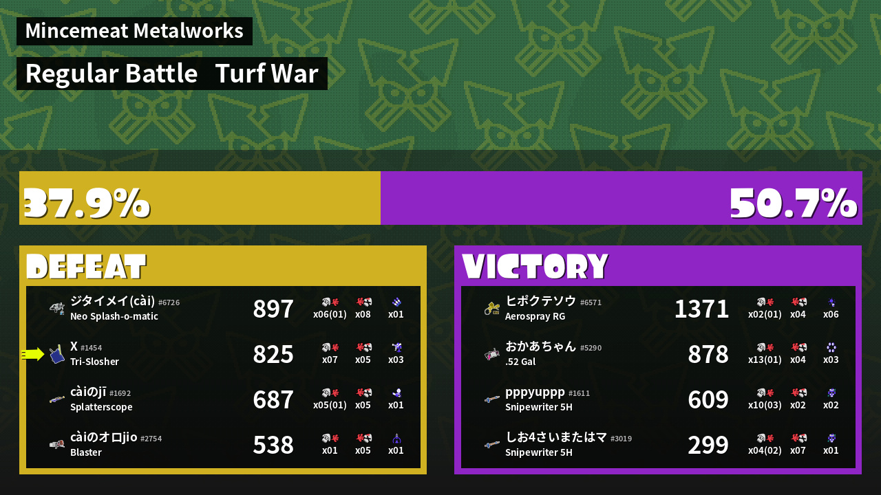 | Medals | #1 Overall Splatter #1 Enemy-Base Inker #1 Enemy Splatter | ||