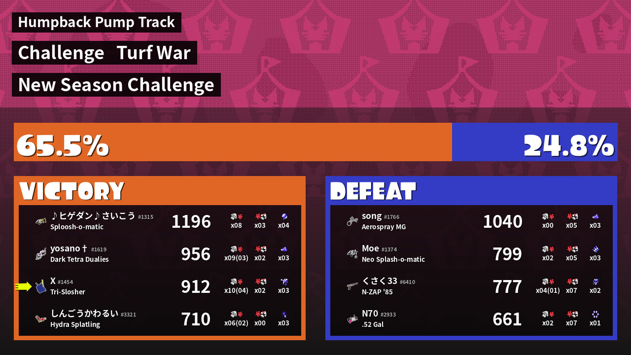 | Medals | #1 Overall Splatter #1 Splat Assister #1 Damage Taker | ||