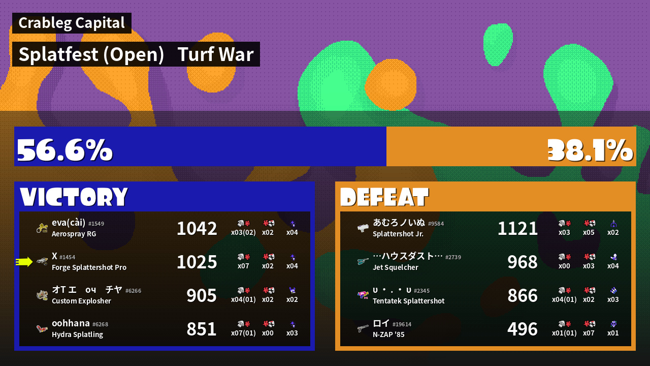 | Medals | #1 Overall Splatter #1 Popular Target #1 Enemy-Base Inker | ||