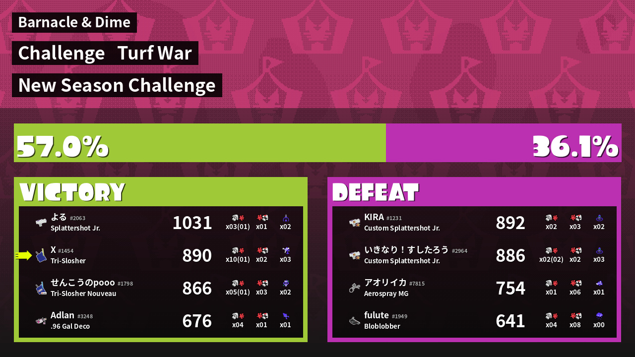 | Medals | #1 Overall Splatter #1 Enemy-Base Inker #1 Enemy Splatter | ||
