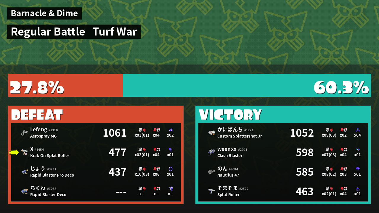 | Medals | #1 Kraken Royale User #2 Overall Splatter #2 Turf Inker | ||