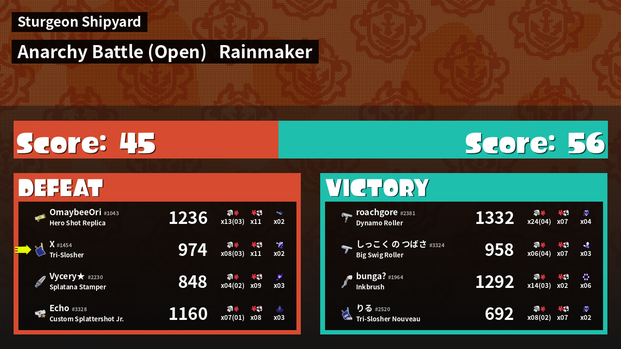 | Medals | #1 Popular Target #1 Splat Assister #1 Rainmaker Carrier | ||
