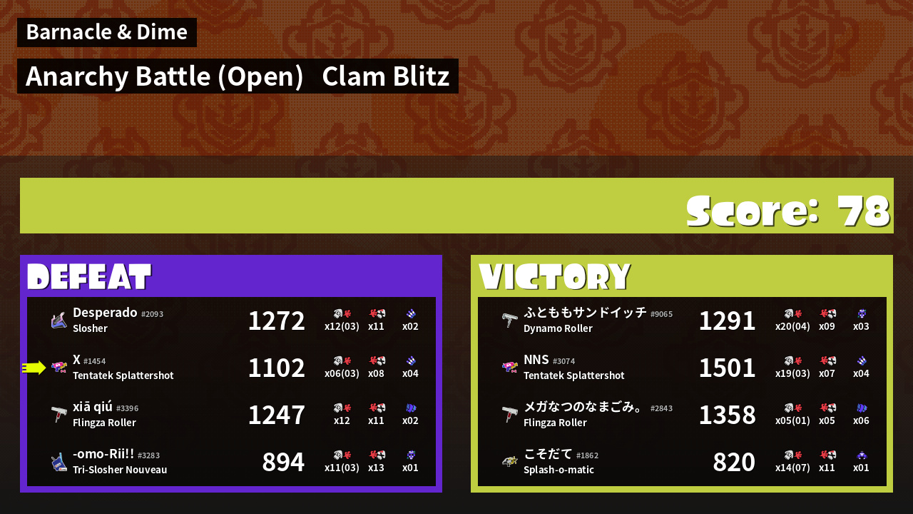 | Medals | #1 Clam Carrier #1 Super Jump Spot #1 Splat Assister | ||